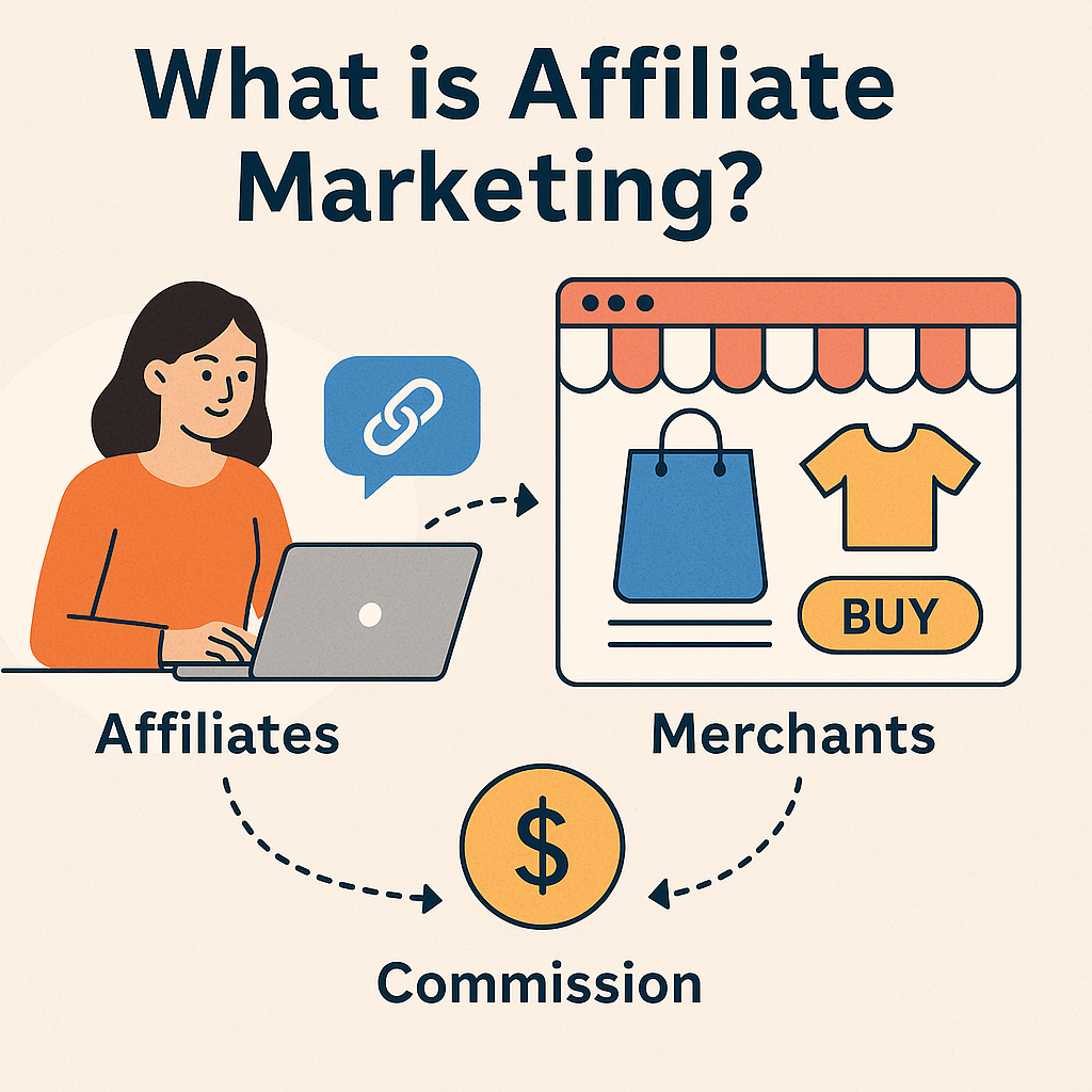 Performance-based marketing Affiliate marketing is a model in which people (affiliates) earn a commission by promoting the products or services of other companies (merchants). Affiliates promote special affiliate links on their blog, social media, or email networks. The affiliate makes a commission for every sale generated through their link.